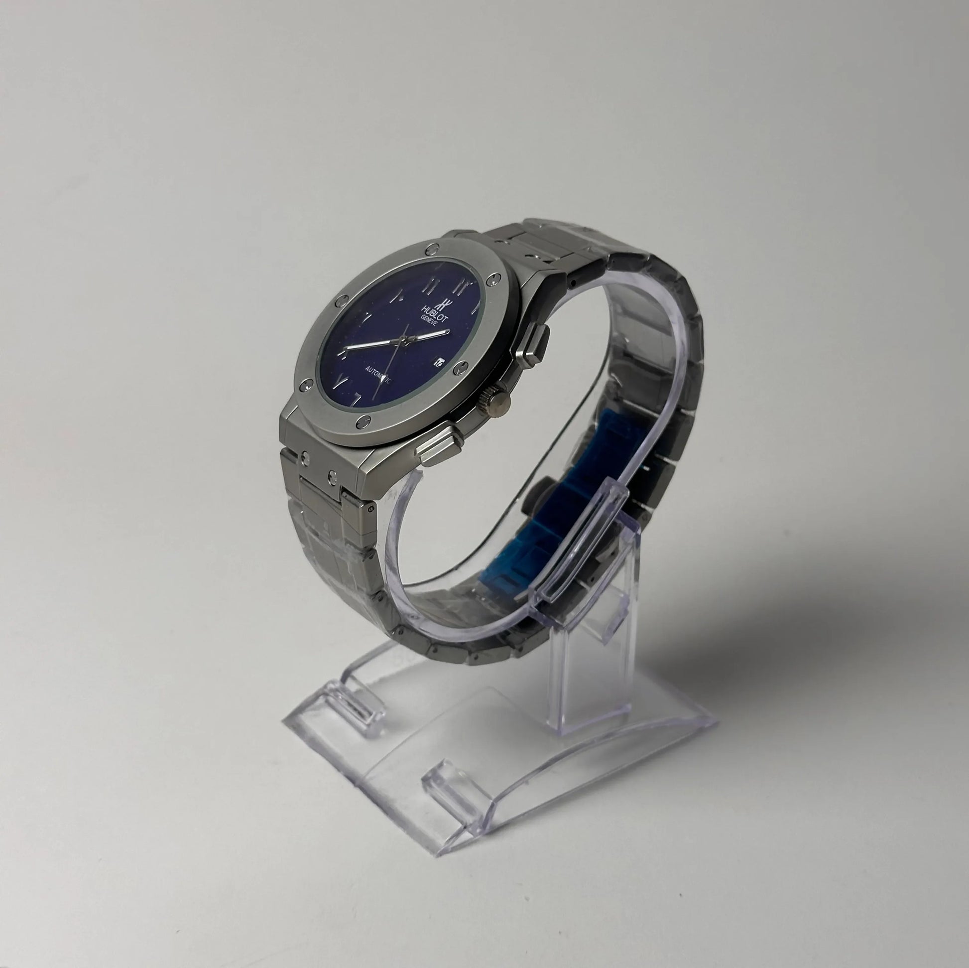 This Hublot men’s wristwatch features a bold Blue dial with a stainless steel strap, combining elegance with durability.